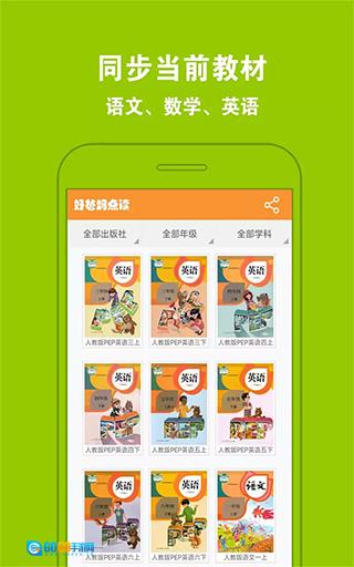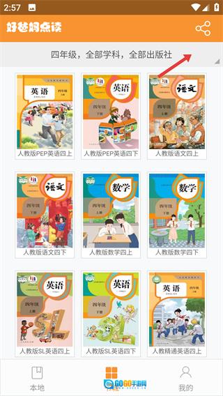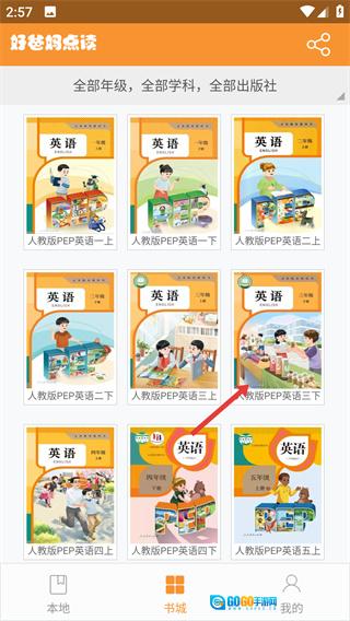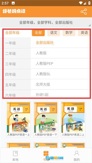 1、在【好爸妈点读】的书城页面,点击顶部显示为【四年级-全部学科-全部出版社】的选择栏,就能切换学习资料的筛选条件。