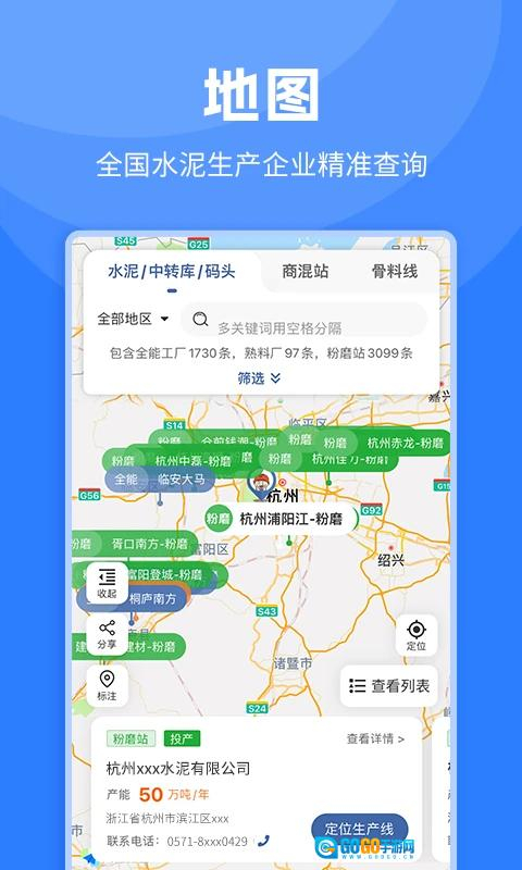 3、整合全国范围内水泥生产线、粉磨站、商品混凝土搅拌站等相关信息,提供便捷的地图查询服务。