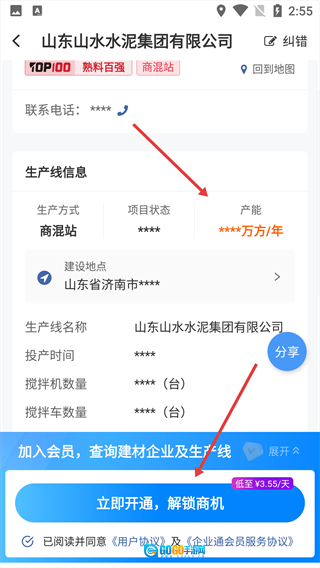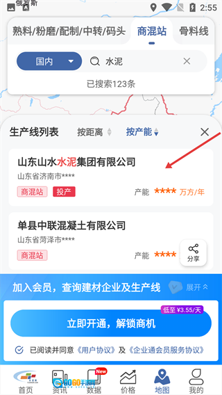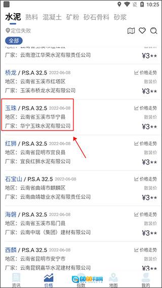2、在水泥产品列表里,点击特定产品,就能查看该产品的地区、生产厂家等详细信息。