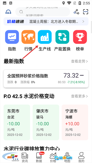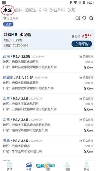 1、启动应用后,点击顶部的【水泥】标签,即可查看水泥相关产品的列表;此外,应用还提供了熟料、混凝土等其他建材类别,供用户进行选择。