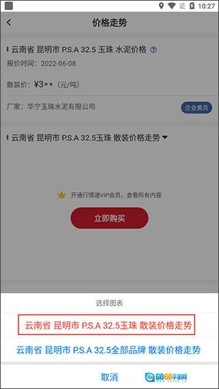 3、点击产品详情里的【价格走势】,在弹出的图表选择界面中,能够选择【云南省昆明市P.S.A32.5珠玉散装价格走势】等相关选项,查看具体的价格走势分析内容,从而为采购决策提供支持。