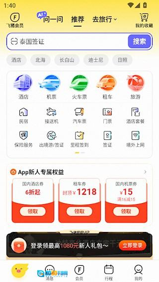 飞猪旅行软件的页面呈现干净整洁的风格,让用户可以使用软件去选择不同的功能,去帮助用户解决问题。无论是想要去选择不同的旅游地点,还是想要去订票和房间,都可以使用软件轻松解决各种问题,满足很多的需求。
