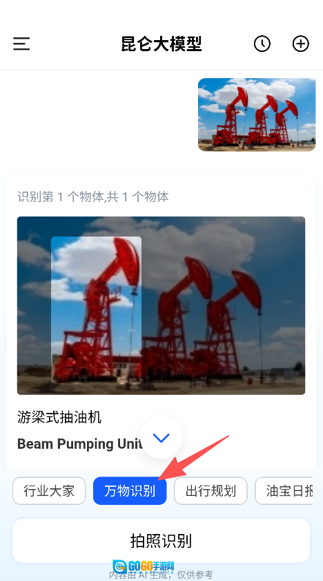 2、万物识别板块支持拍照识别能源相关物体,直接呈现识别结果,适配能源场景的物体识别需求。