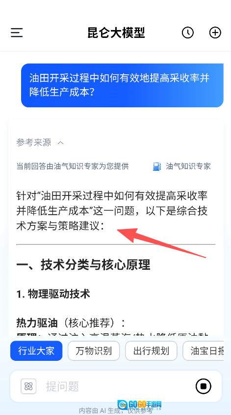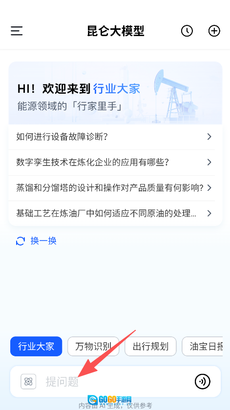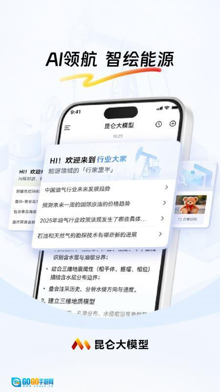 《昆仑大模型》是一款能源领域服务类软件,设行业大家万物识别出行规划油宝日报等板块,行业大家板块提供能源相关预设问题,涵盖设备故障诊断数字孪生技术应用等内容,也可输入问题提问,获取综合技术方案与策略建议。万物识别板块支持拍照识别物体,呈现识别结果及对应名称,覆盖能源领域知识查询与物体识别的需求,让能源相关的知识获取与物体识别更便捷,满足能源场景下的各类信息需求,提升能源领域内容获取的高效性与适配性。
