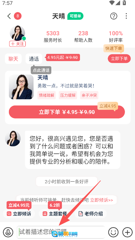 3、在页面点击立即下单,进入交流页描述问题开展心理倾诉。
