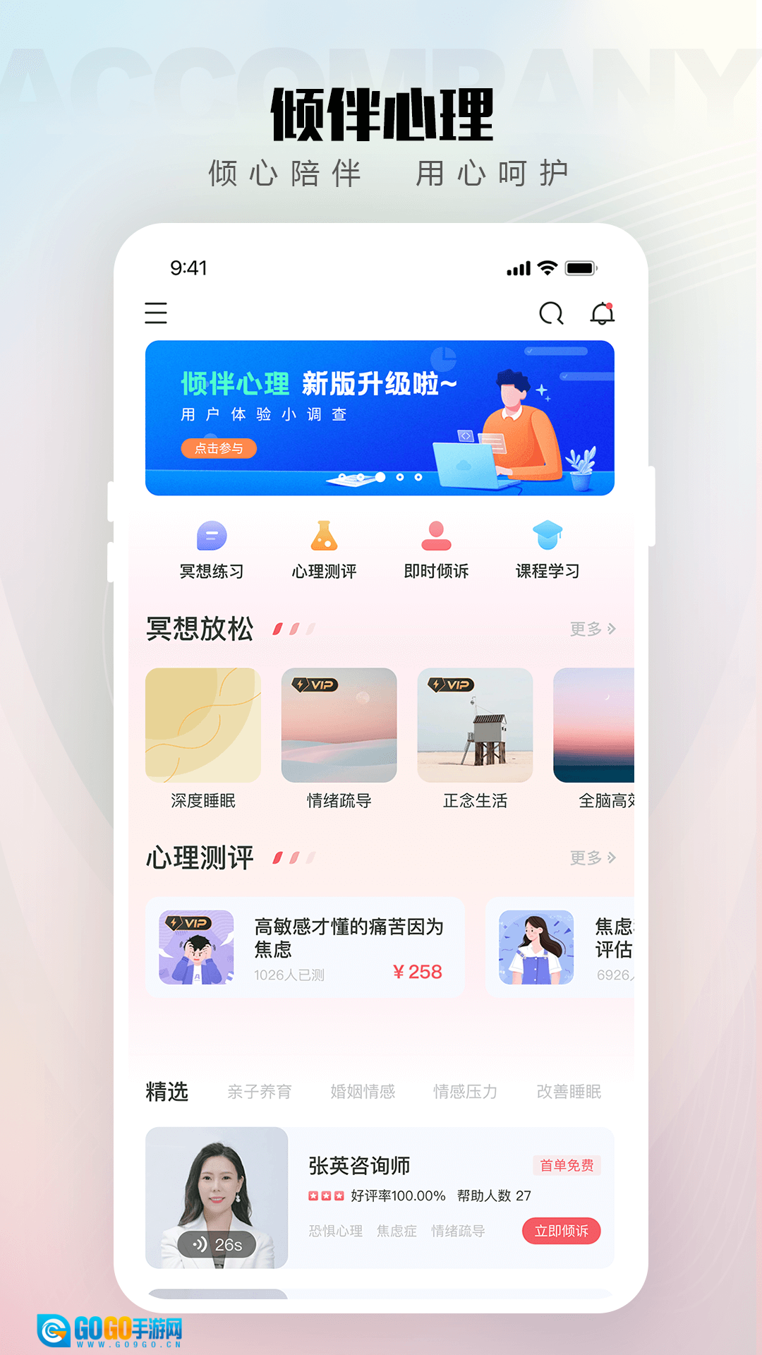 1、设情绪压力等多分类及倾诉解忧等模块,覆盖不同心理需求场景,精准匹配各类心理服务的获取需求。