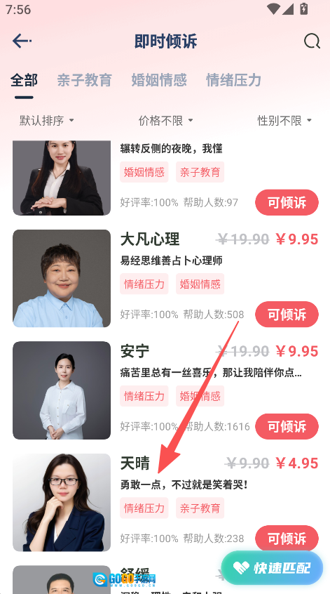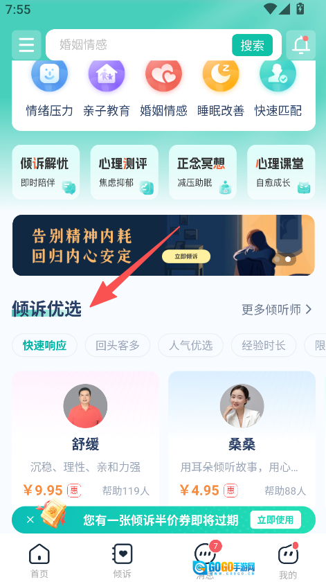 1、进入首页,选择倾诉优选板块查看倾听师列表。