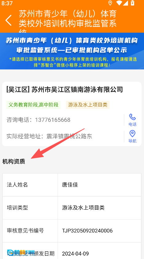 2、体育培训板块呈现培训机构审批监管信息,含所属地区培训项目等内容,辅助了解机构合规性与服务方向。