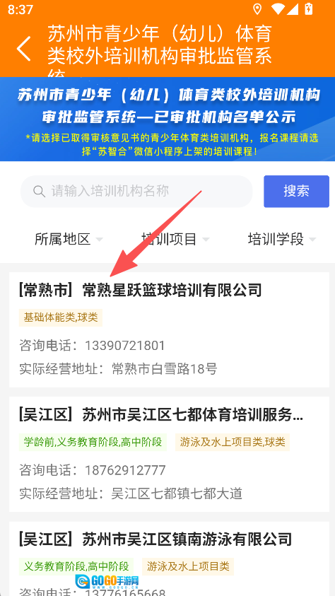 2、在体育培训页面查看青少年体育培训机构名单,选择目标机构。
