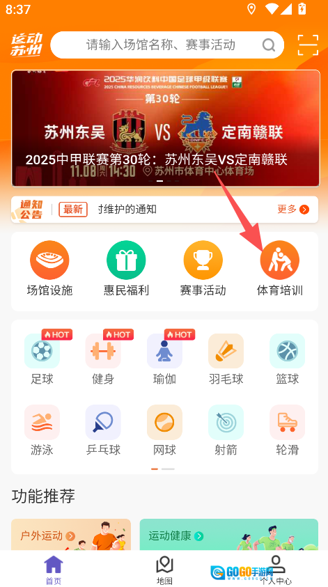 1、打开运动苏州进入首页,点击体育培训模块进入对应页面。