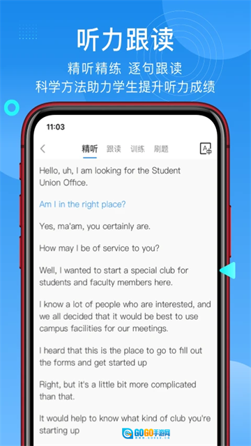 3、强化听力和跟进阅读:支持TPO和朗文听力材料的逐句详细听力、中英文比较、双倍速度回放和实时跟进阅读评分,全面提高听力和口语技能。
