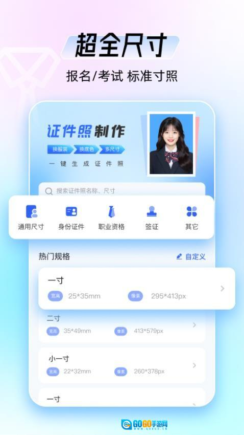 4、丰富尺寸选项:拥有全面且分类清晰的证件照尺寸资源库,涵盖全球各国常用规格,助力用户快速找到匹配尺寸,轻松制作出符合要求的证件照片。