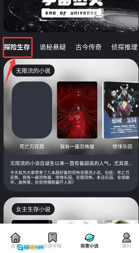 3、探险生存小说板块围绕荒野求生与秘境探索的核心主题,呈现一系列情节紧张刺激的冒险故事。