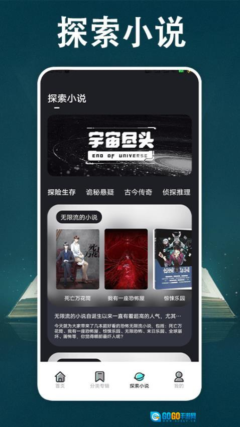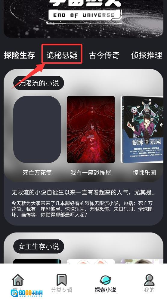 2、诡秘悬疑小说专区汇聚了各式各样的推理惊悚类作品,涵盖了灵异事件、心理悬疑等不同的细分类型。