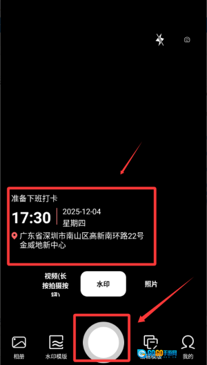 2、开展拍摄记录工作:进入拍摄界面后,先确认水印信息准确无误,随后按下快门完成拍照操作,或长按快门进行视频录制。