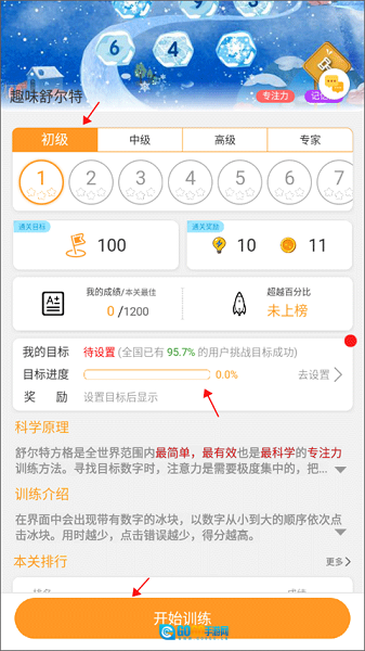 2、这项训练设有初级、中级、高级、专家等不同级别,你通过关卡后可获得脑力与蛙币,点击“开始训练”即可参与。