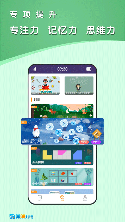 1、打开软件进入主界面【今日】后,切换至【训练】界面。该界面包含多种可锻炼专注力、记忆力、逻辑力等能力的训练游戏,从中选择专注力类别的“趣味舒尔特训练”即可。