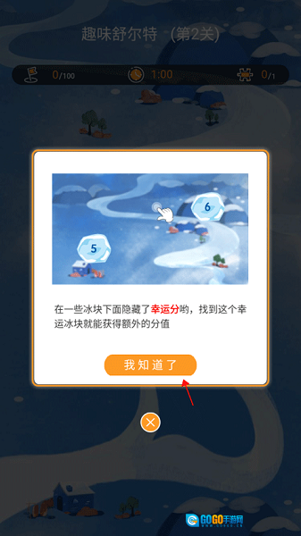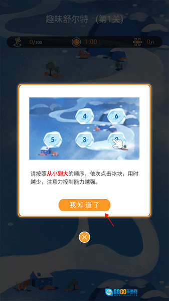 3、页面弹出了这项训练的基本玩法,就是按照从小到大的顺序来依次点击冰块,用时越少就表示注意力控制能力越强,点击“我知道了”关闭窗口。
