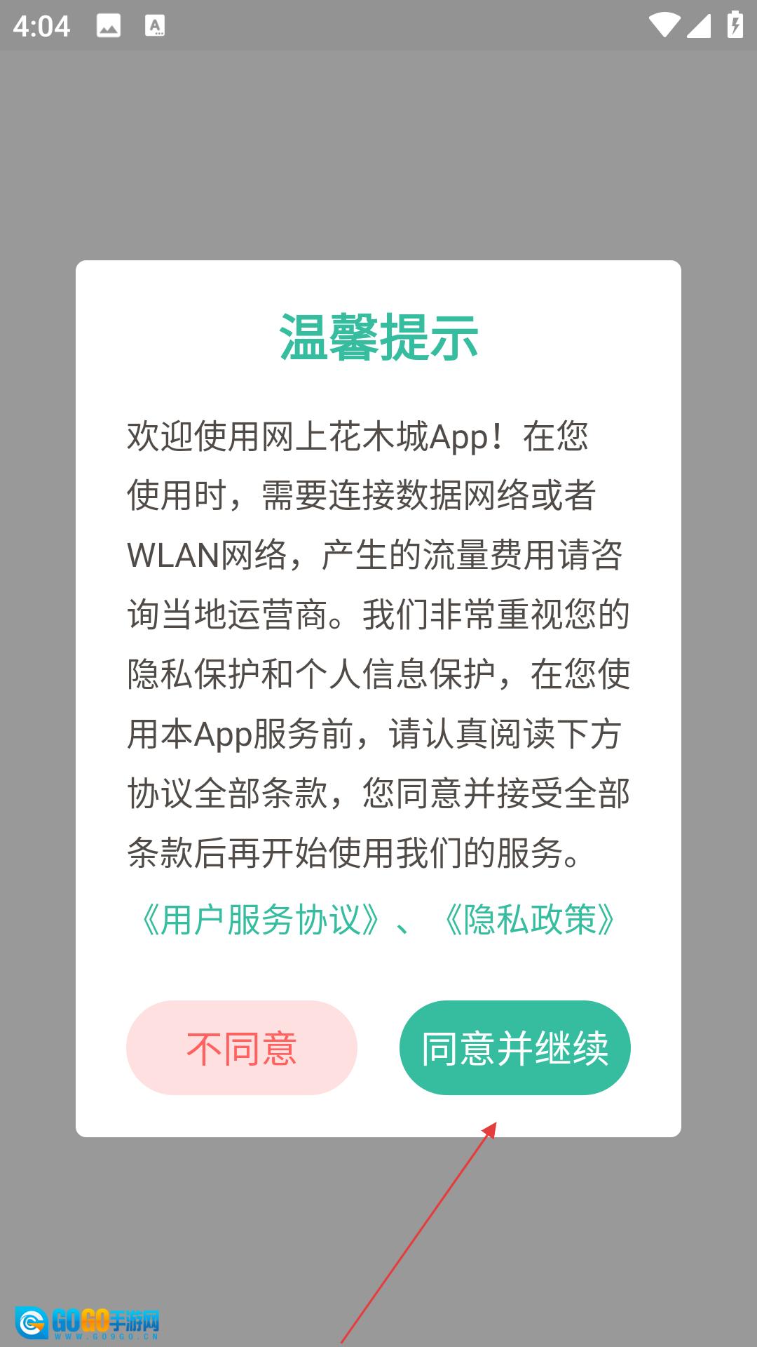 使用网上花木城前,请先阅读温馨提示,了解网络及隐私相关说明,若同意相关条款请点击“同意并继续”,若不同意则选择“不同意”。