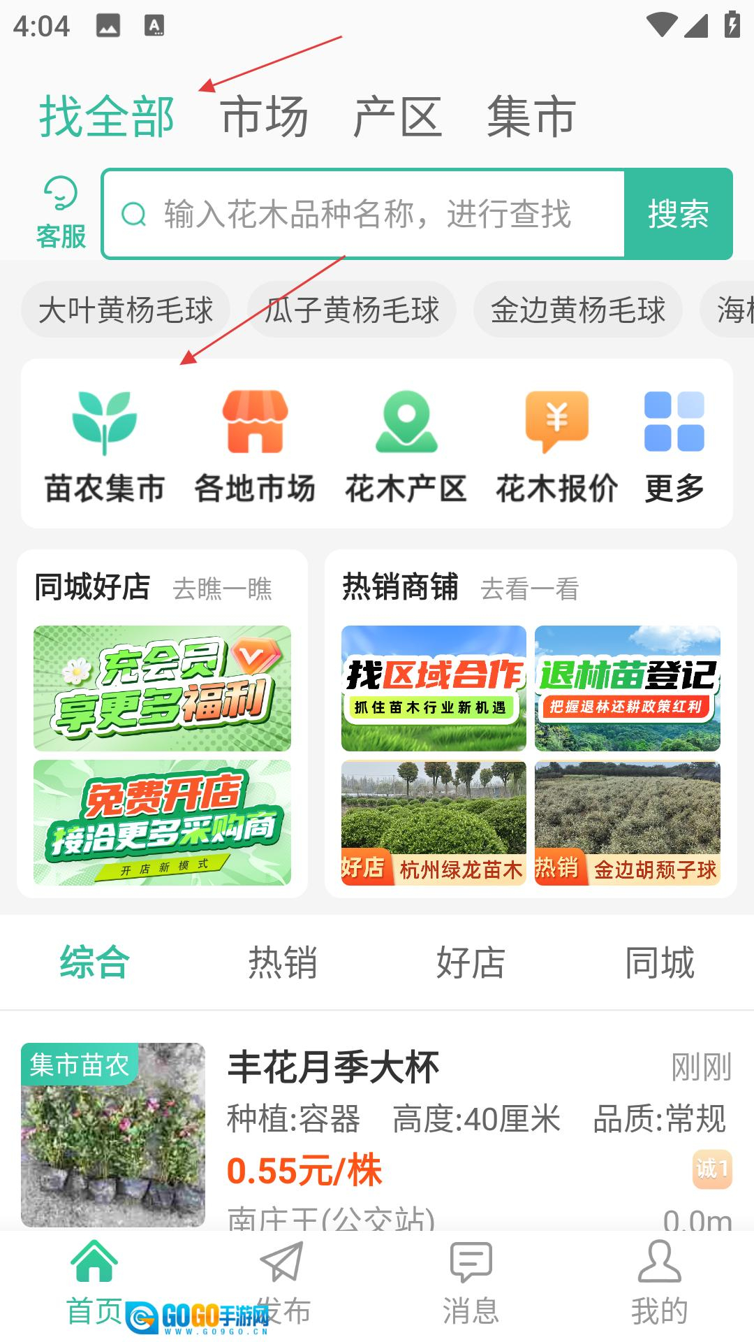 软件首页设有搜索栏以及苗农集市等功能板块,用于展示花木商品的相关信息,此外还包含同城好店、热销商铺等推广区域。