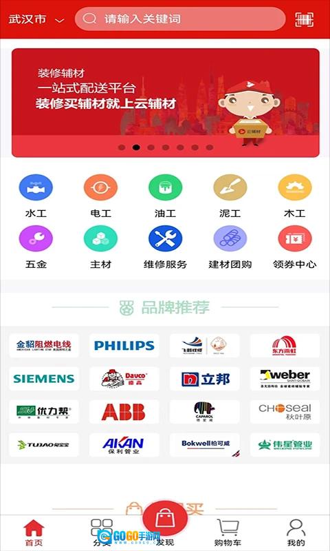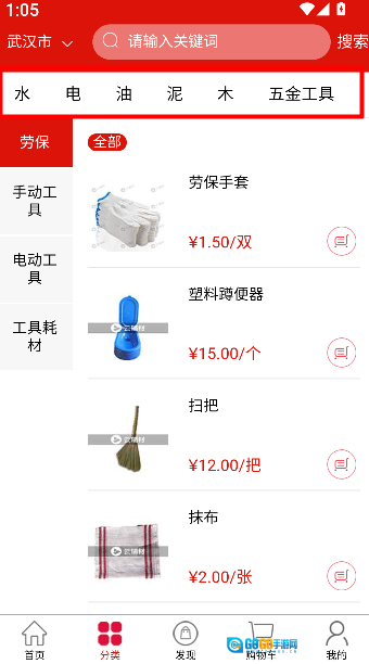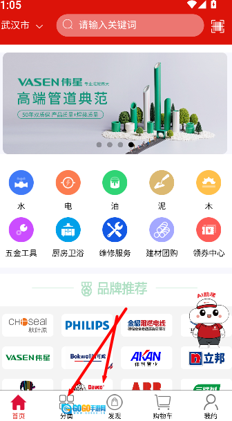 1、打开《云辅材》软件进入首页后,在功能导航区域找到 “产品分类” 板块,点击进入后可查看水工、电工、五金等细分品类。