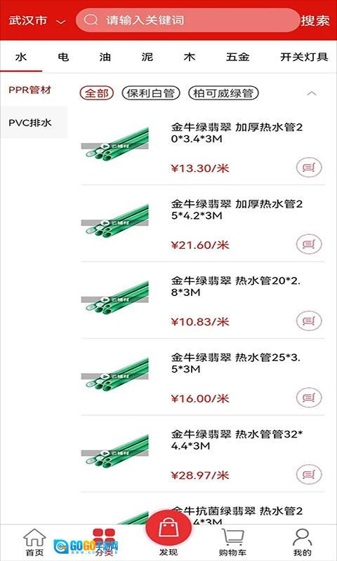 2、在分类列表中选择对应品类,浏览水管电线、水泥沙、防水涂料等配件,点击目标配件可查看参数、价格与正品保障信息。