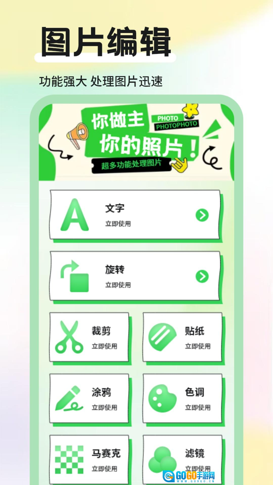 桃花源是一款功能丰富强大的图片编辑软件。它集成了丰富的滤镜、特效和编辑工具,使每张照片呈现出独特的艺术效果,轻松满足用户在社交媒体上分享高质量照片的需求。照片调色、添加滤镜、更换背景、添加贴纸、裁剪等操作简便,满足用户多样化的编辑需求,打造专属的照片作品。任意的编辑模式让你在这里充分发挥你的想象力,让单调的照片变得更加丰富多彩。