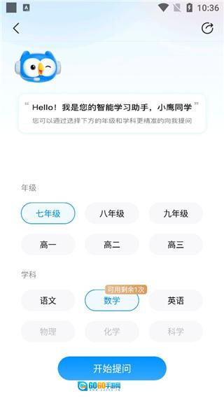 1、打开首页,找到并选择“小鹰爱学”板块。 2、进入该板块后,先选定对应的年级与学科,接着点击“开始提问”按钮就可以了。