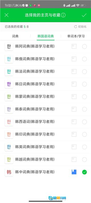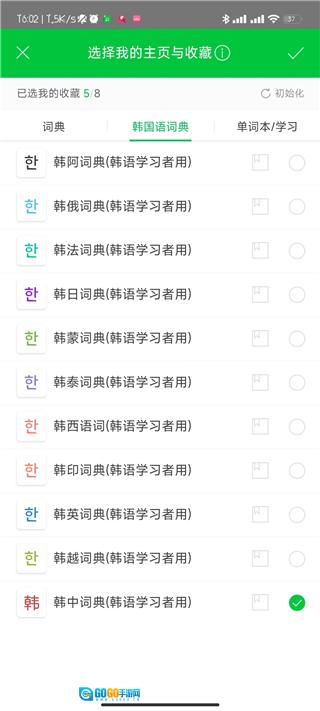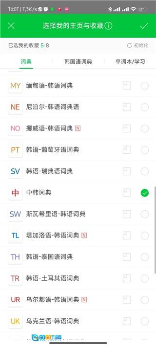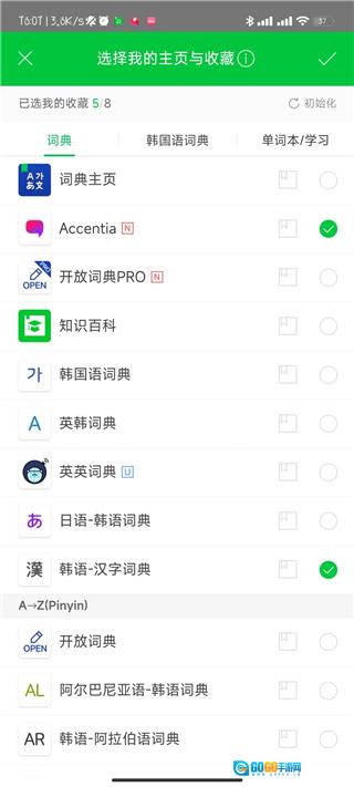 3、进入"我的主页与收藏"设置页面后,勾选"中韩词典"选项。