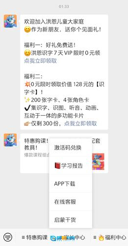 可以关注洪恩儿童公众号领取兑换码,之后在家长中心的激活码兑换页面输入该兑换码。