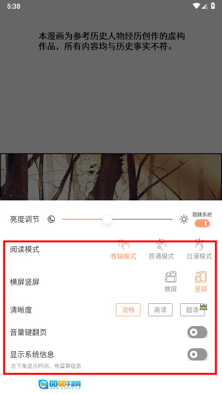 5.点击设置,可以看到支持亮度调节、阅读模式切换、横屏竖屏、清晰度、音量键翻页、显示系统信息等设置。