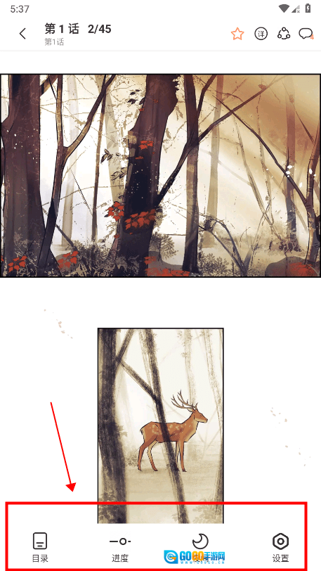 4.在阅读页,提供目录、进度、夜间、设置等功能。