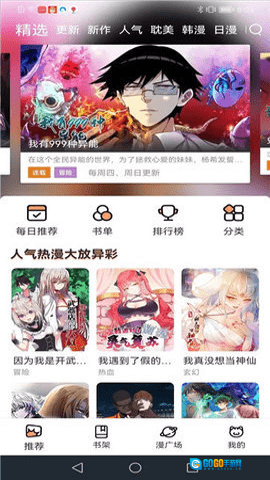 2.在首页,我们可以看到精选、更新、新作、人气、耽美、韩漫、日漫、欧美等多个板块。