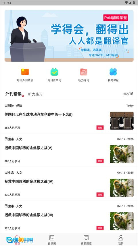 佩琪翻译是一款为学员提供学习翻译知识的软件工具。这款软件最明显的好处就是占内存小,打开后界面清爽没多余东西,用起来一点不复杂。想背单词的话,挑好对应的词库,再定个每天要背的量就行。能练听力,每天听听磨磨耳朵,对提高英语听力挺有帮助,过四六级的时候能更轻松。要是有背单词、练听力的需求,或者想备考四六级,来用用肯定不亏。
