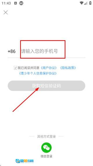 3、进入登录页面后,先填写手机号,接着勾选相关协议,之后点击“获取验证码”按钮。