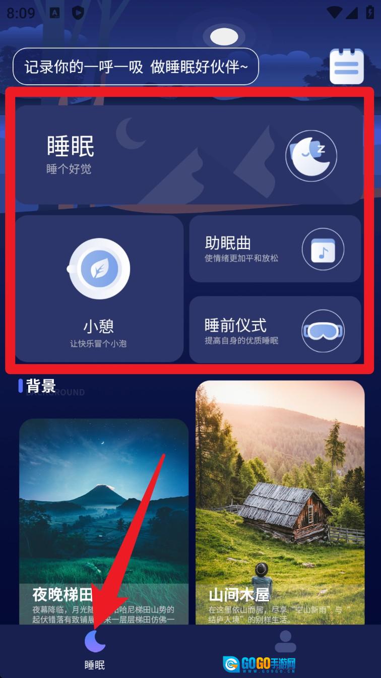 1. 打开App后,点击底部的睡眠图标进入主功能页面,在这里可以选择睡眠、助眠曲、睡前仪式等多种不同模式。