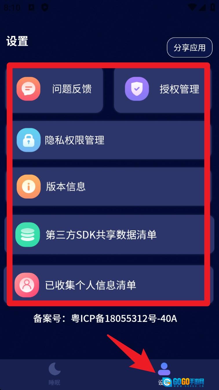 4. 点击底部的设置页面,能够查看已收集信息清单、隐私权限管理、SDK共享列表等相关内容,并且可以对这些内容进行调整。