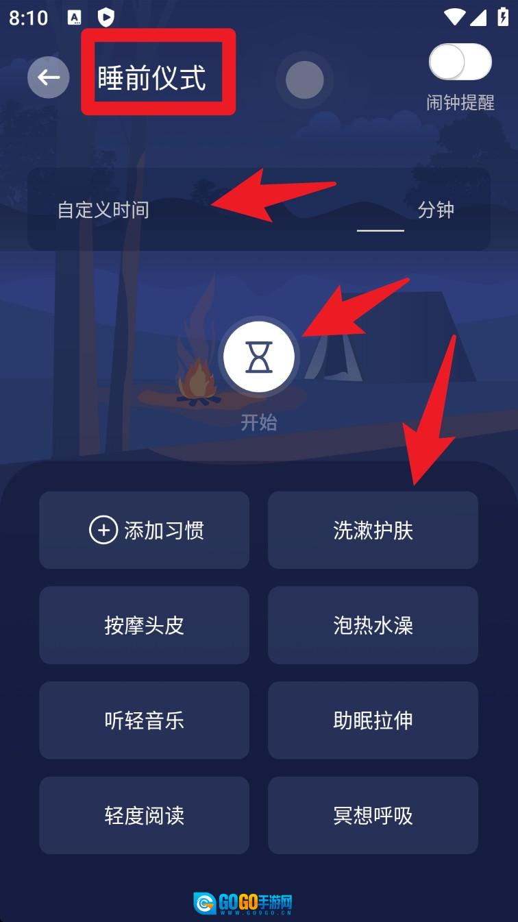 3. 进入睡前仪式模块,可添加洗漱护肤、听轻音乐、冥想呼吸等项目,并能自定义每项的计时时长。