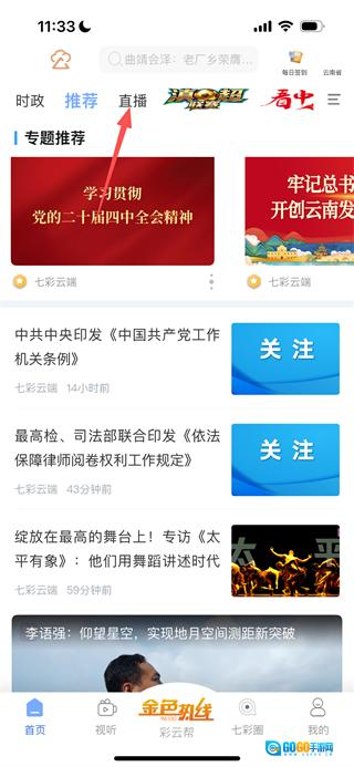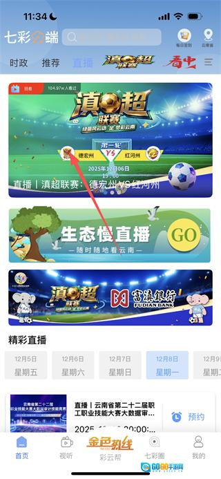 1、打开七彩云端应用,在首页找到顶部的“直播”选项并点击,即可进入直播页面。
