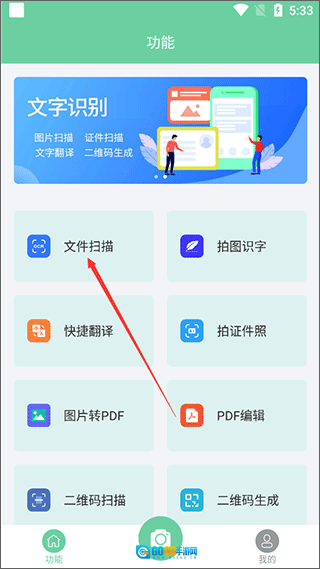 1、启动智能扫描宝应用,进入“功能”页面后挑选你要使用的功能,这里小编就以“文件扫描”功能来举例说明;