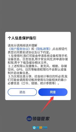 1、初次打开领猫管家应用时,系统会弹出用户协议与隐私政策提示,用户阅读完毕并点击同意后,即可进入主界面。