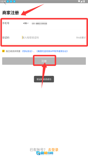 3、输入手机号与验证码,勾选协议完成账号注册。