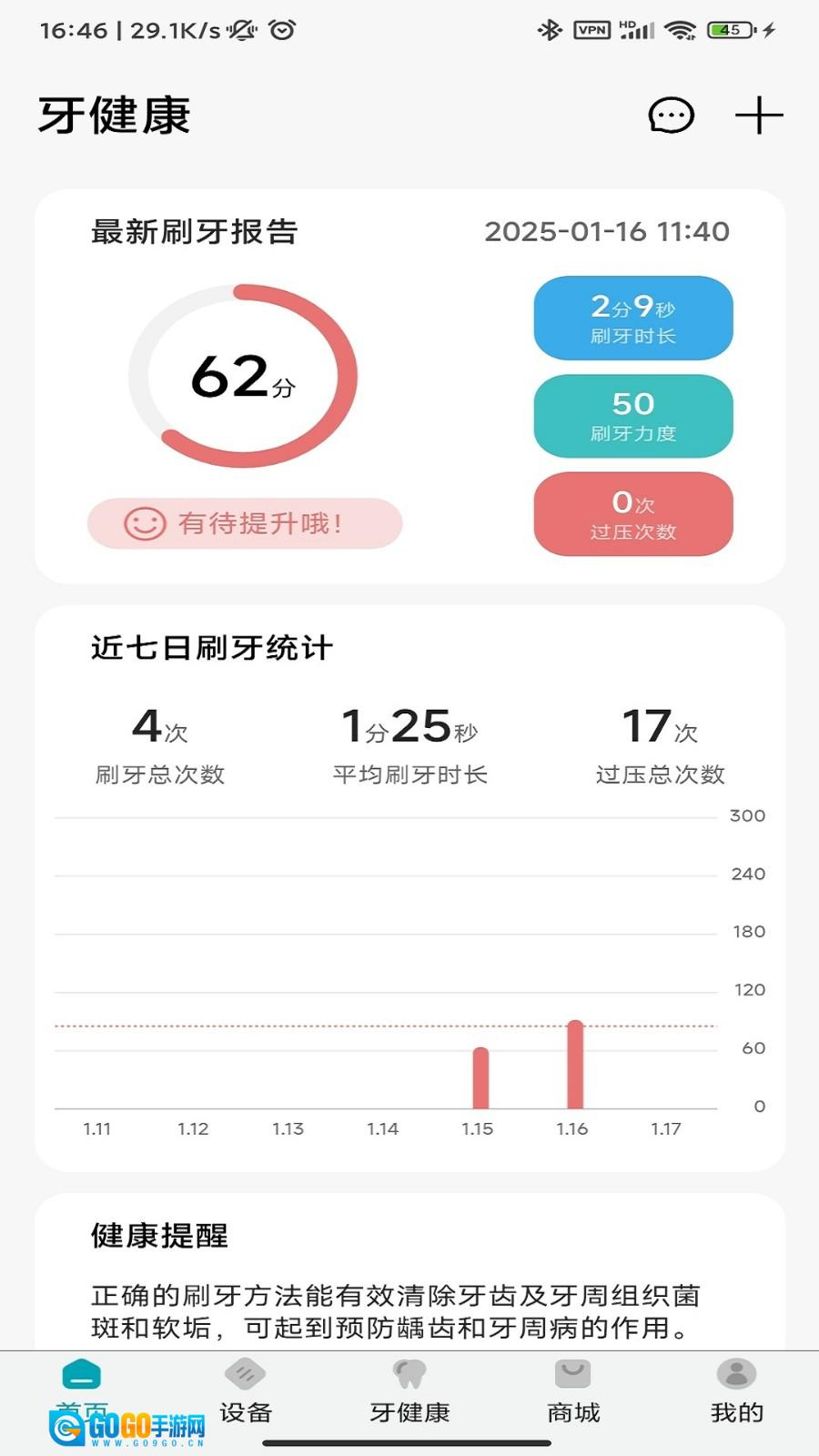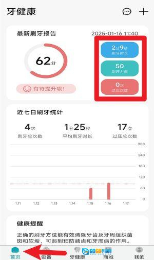 4、借助牙健康统计图表,可查看近七日的刷牙次数、平均时长以及过压情况,从而有效监测口腔清洁状况。
