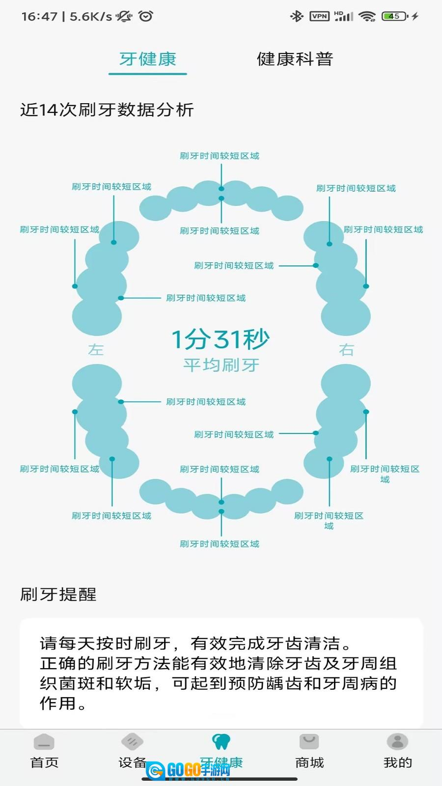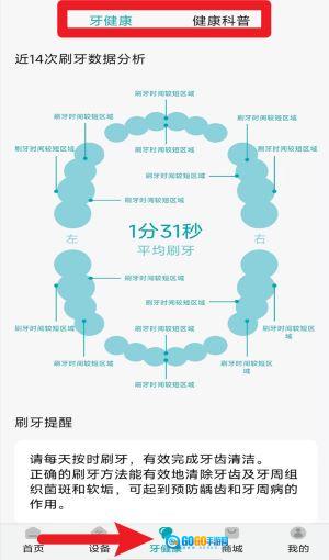 3、点击牙健康标签页,就能查看每次刷牙的时长、力度以及过压次数,助力用户了解自身刷牙效果并掌握刷牙习惯。