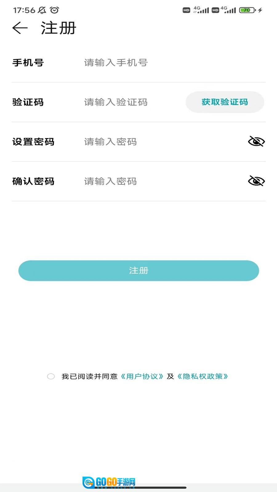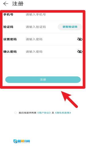 1、打开后,先在注册页面填写手机号码并获取验证码,接着设置并确认登录密码,即可完成注册。