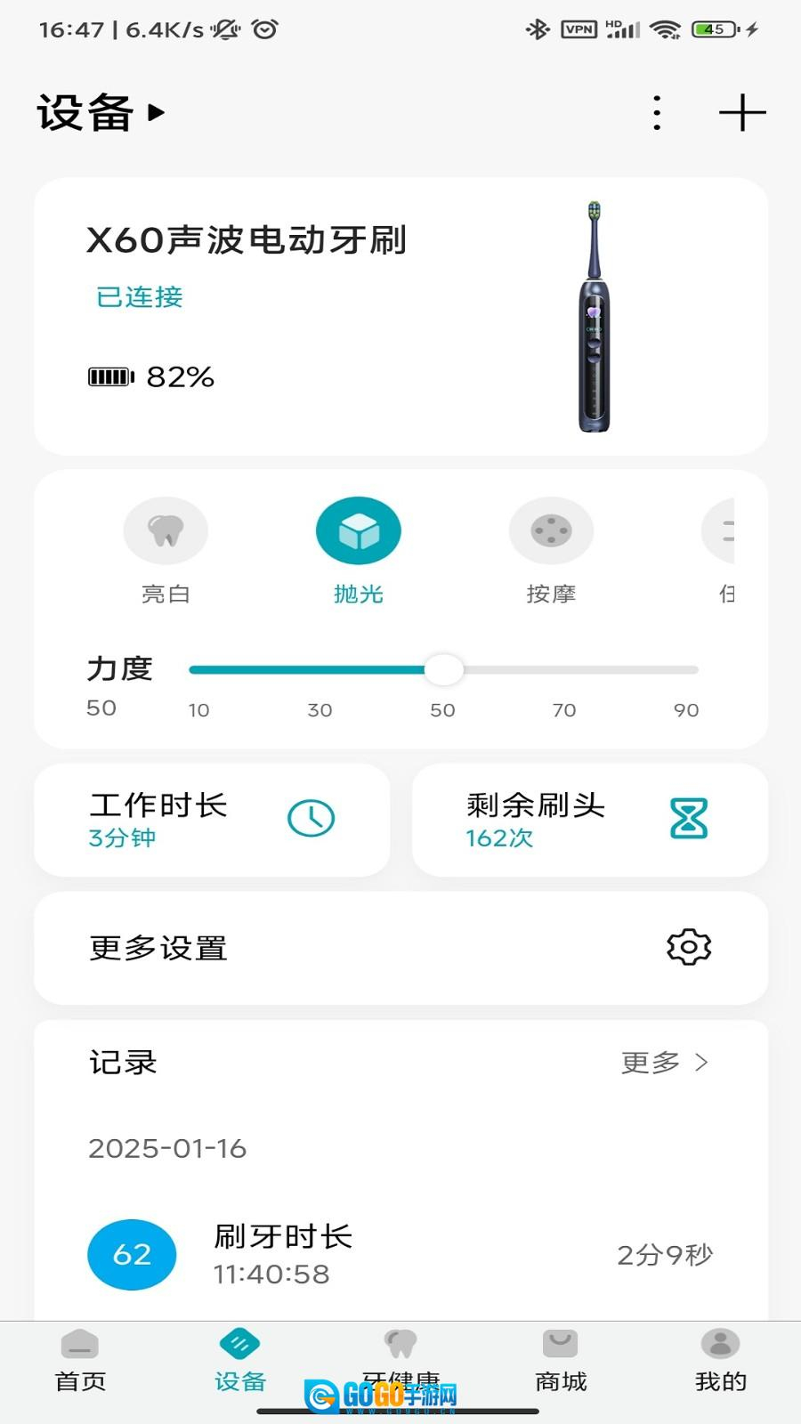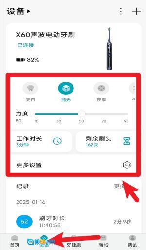 2、进入设备页面,在与声波电动牙刷成功建立连接后,能够对亮白、抛光、按摩等模式进行自定义设置,同时还可以调整清洁力度。