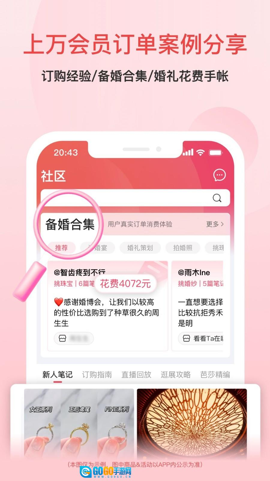 4、在社区页面,用户能够浏览其他用户分享的备婚合集以及婚礼花费账单,这样有助于他们借鉴参考并制定预算。