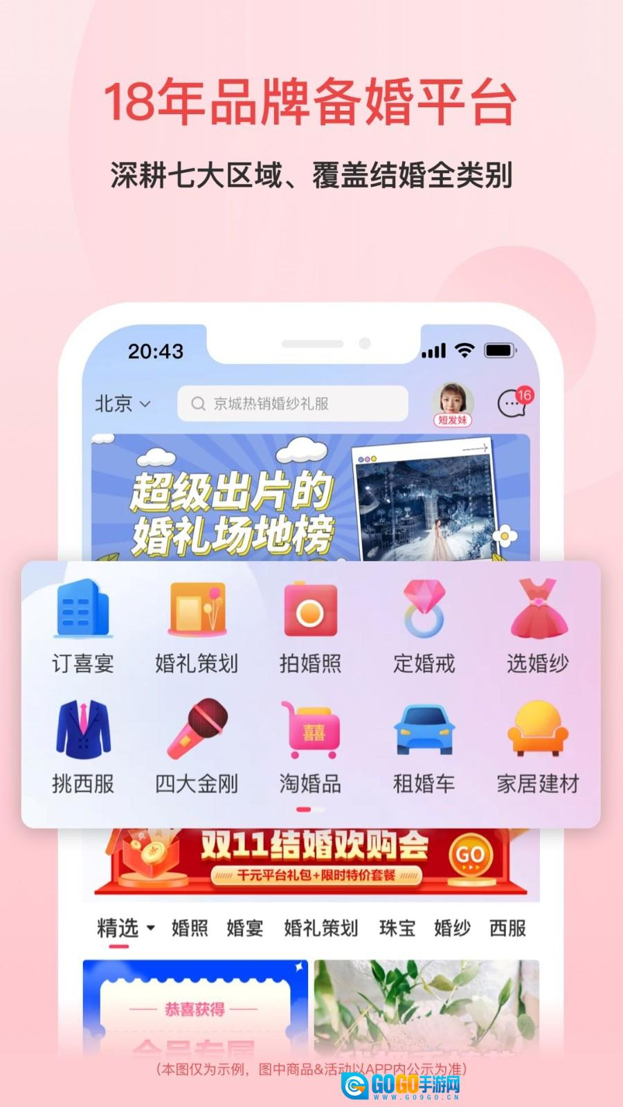 2、首页导航图标包含婚礼策划、拍摄婚照、挑选婚纱等功能板块,通过一键直达的方式,满足新人多样化的备婚需求。