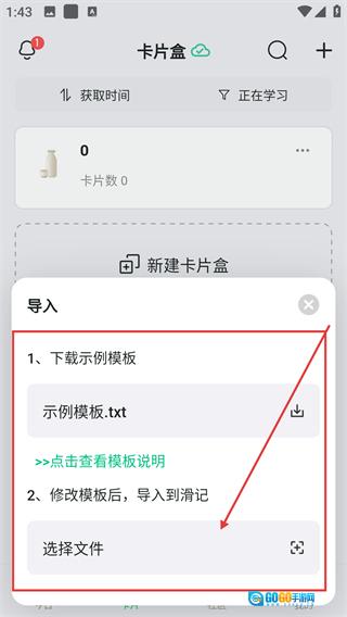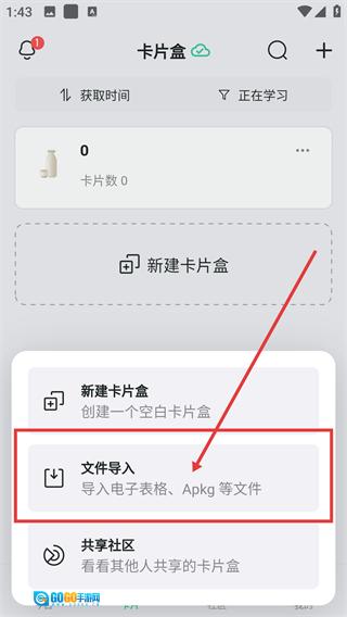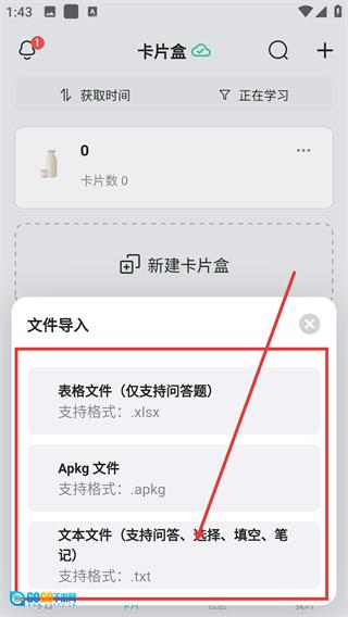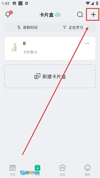 在卡片盒页面,点击右上角的【+】按钮,即可打开卡片盒的操作功能菜单。