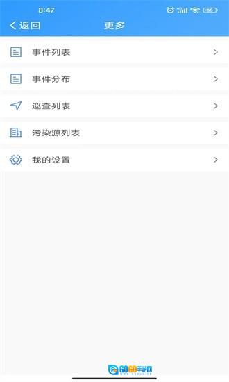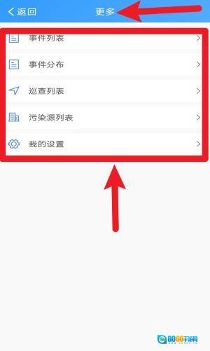 3、点击首页的“更多功能”进入扩展选项,就能查看事件列表、污染源列表以及个人设置等辅助功能。